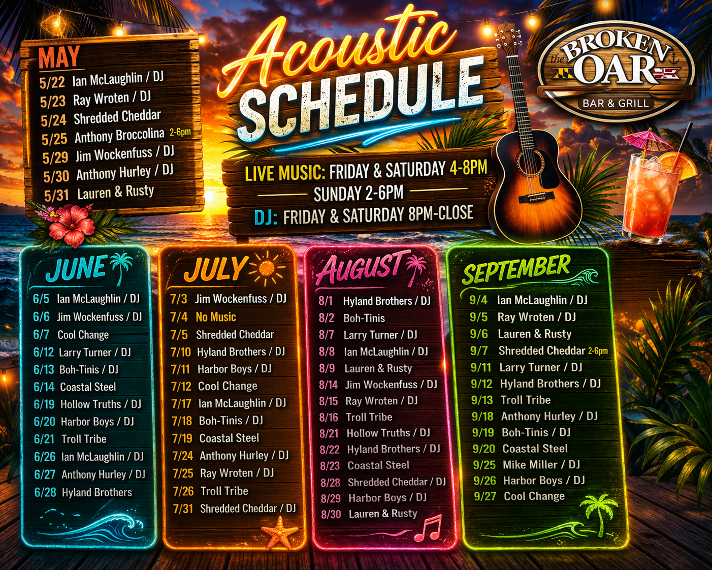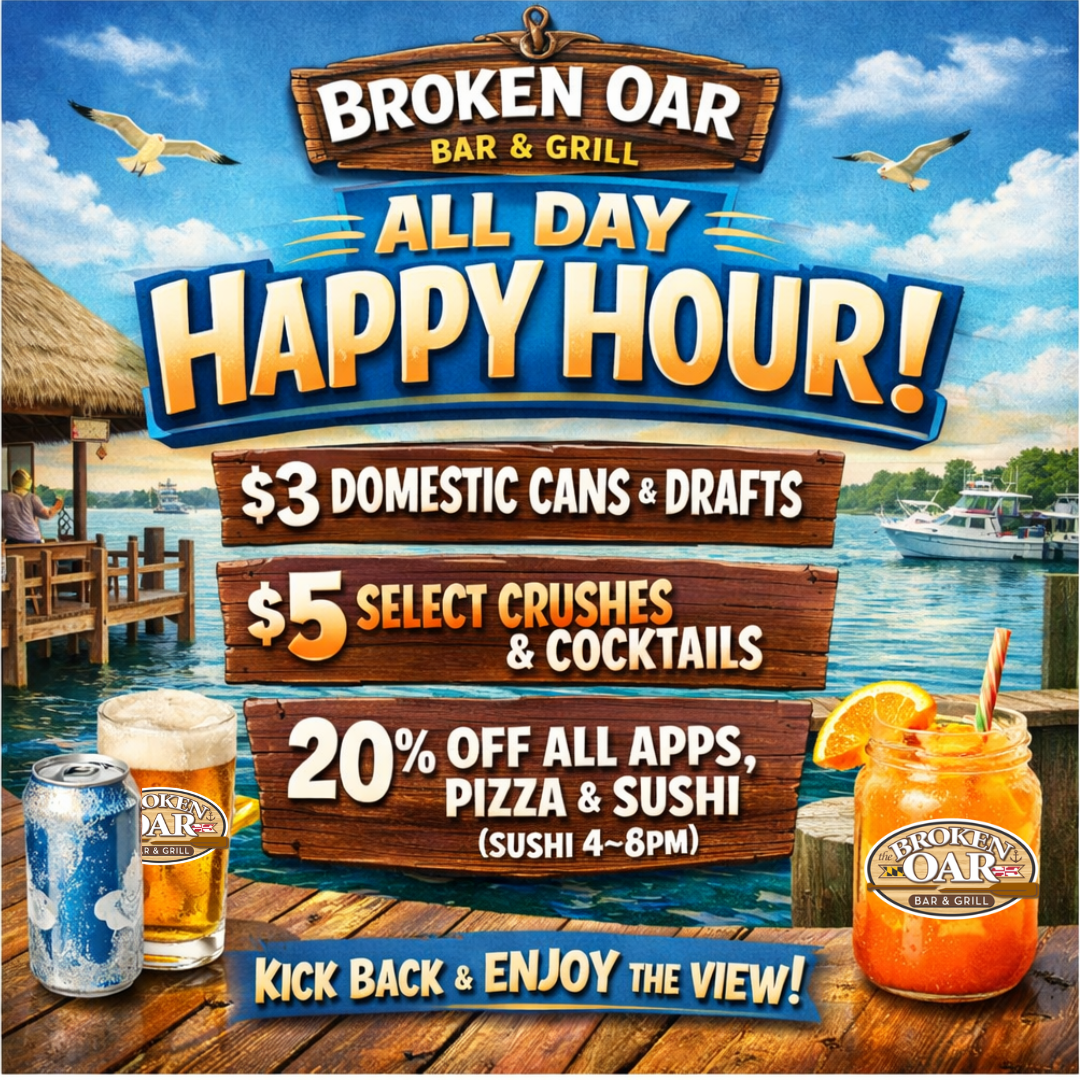 Grab your friends, hop on a boat, and come enjoy great food, cold drinks, and unbeatable scenery at Broken Oar Bar and Grill!